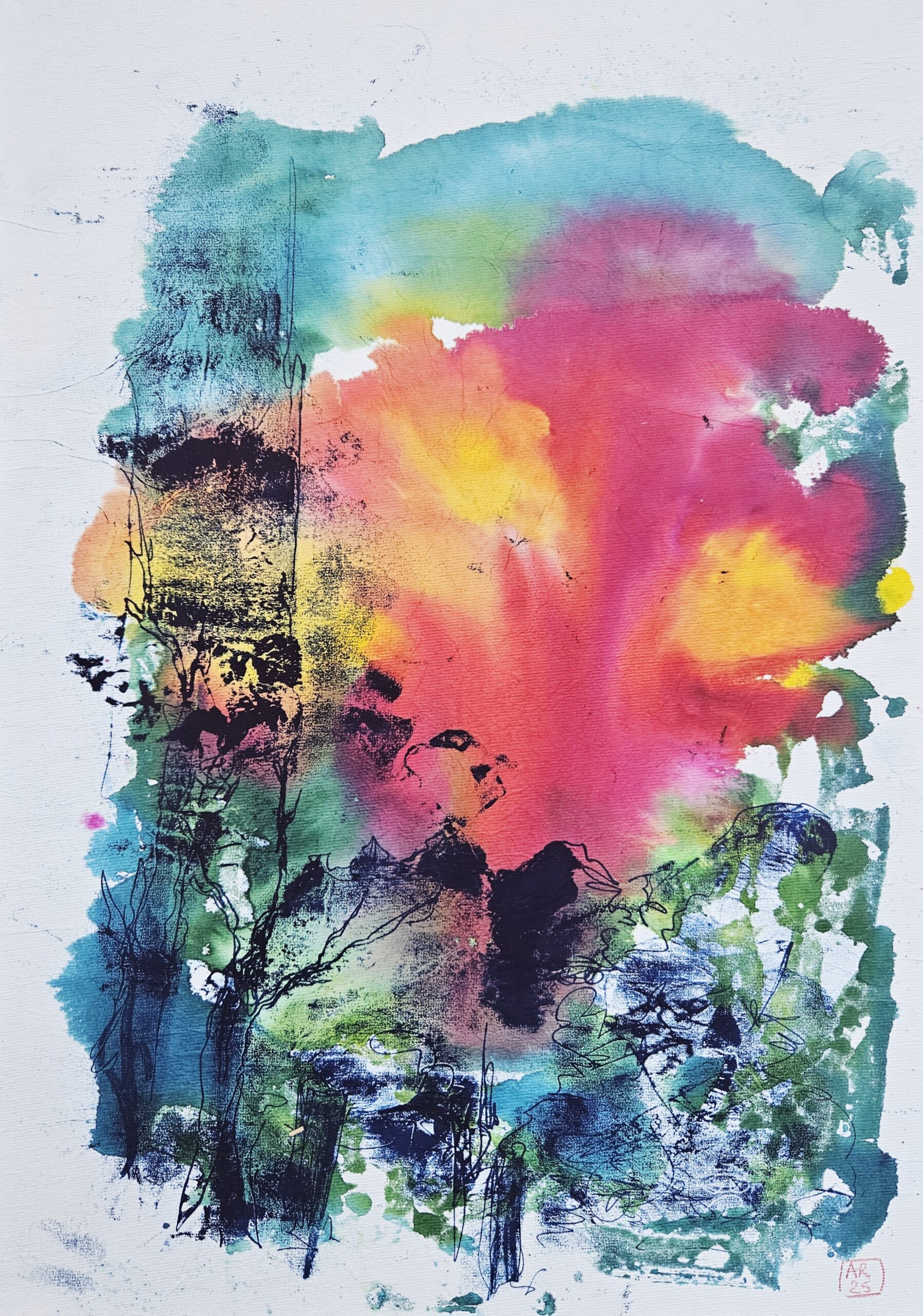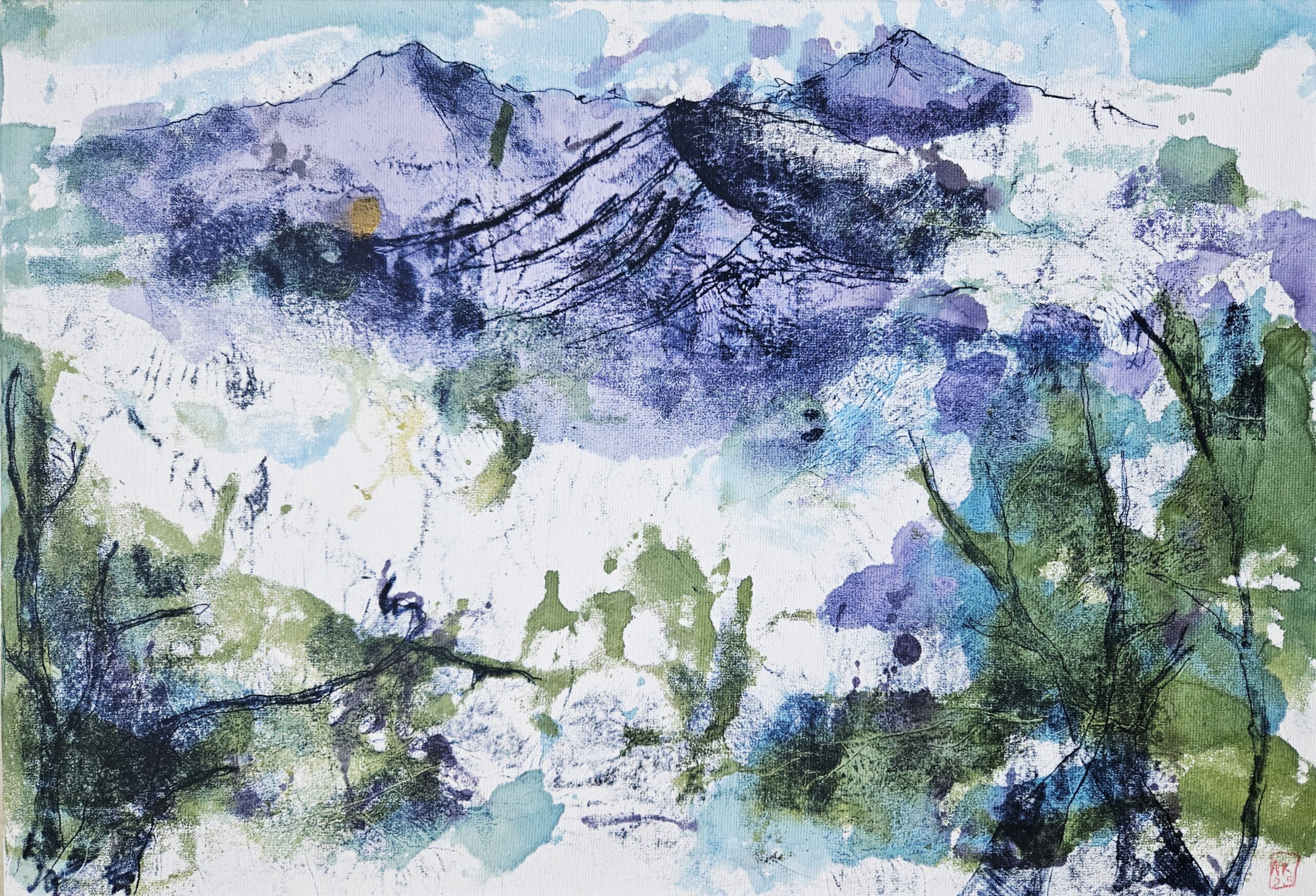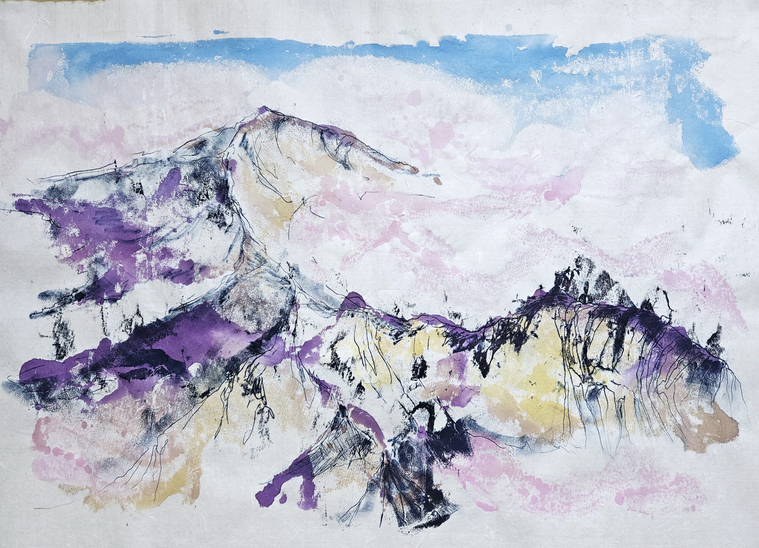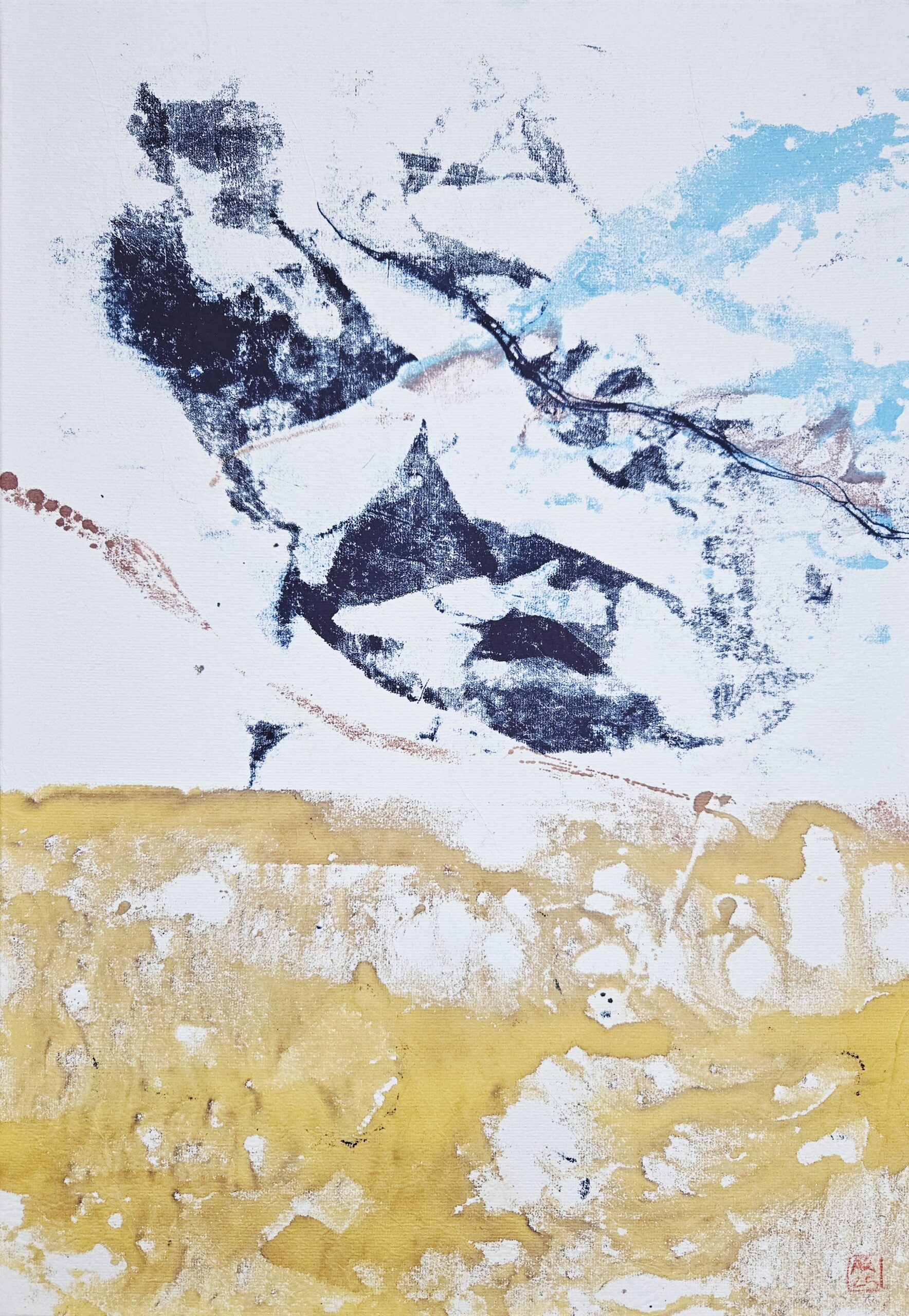 J’expose ici pour la première fois une série de monotypes réalisés à l’encre acrylique colorée et à l’encre de linogravure, ainsi que des aquarelles faites à partir de peintures japonaises Gansai.
